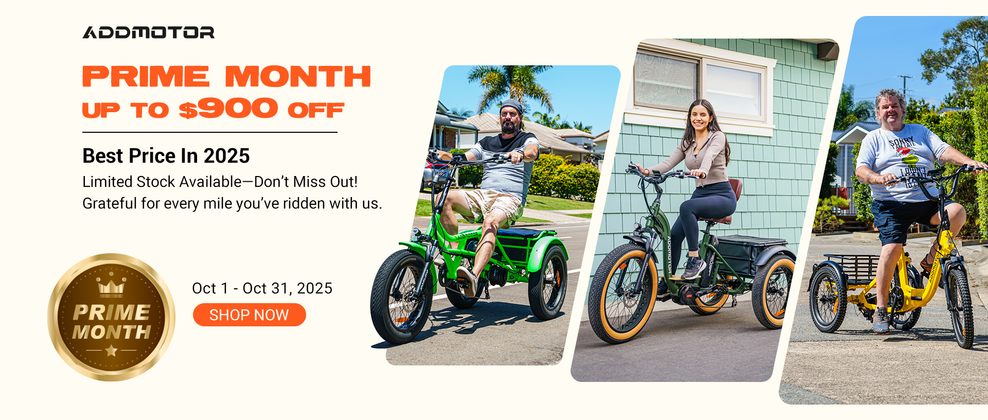 Hurry—limited stock! Ride further, spend less with Addmotor trikes. Prime Month 2025: Save up to $900 in the biggest sale of the year. Offer Period: September 30 – October 31. Shop Now!